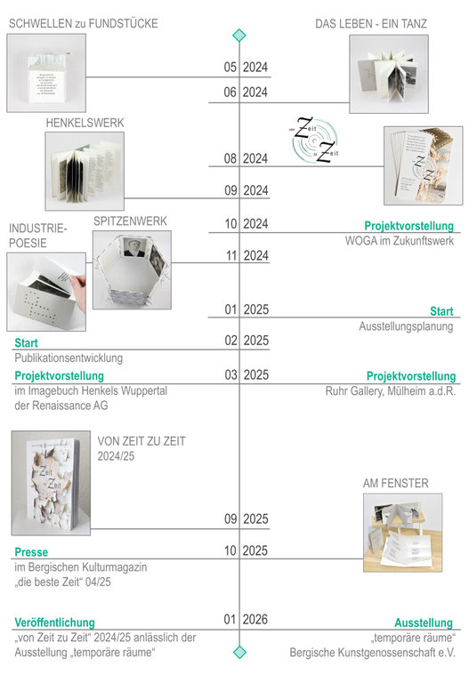 Die Wuppertaler Künstlerinnen Kirsten Radermacher (Fotografie, Buchkunst) und Jutta Höfel (Text) entwerfen in ihrem Projekt „von Zeit zu Zeit“ ein Porträt ihrer Stadt mit dem für sie charakteristischen Schwerpunkt industrieller Geschichte. Ein Ansatz der interdisziplinären Arbeit ist die Auseinandersetzung mit Relikten aus zufälligen Begegnungen oder durch gezielte Spurensuche mit Kamera, Stift und Papier, begleitet von historischen Recherchen an Orten, an denen Schwellen zwischen Epochen sichtbar werden. Bilder, Texte und Artefakte werden in metamorphen und reduktiven Prozessen unter anderem zu Buchobjekten, in denen Bilder und Worte ästhetische Assoziationsräume öffnen, die mit der Lust des Betrachtens, Lesens, Empfindens und Nachdenkens Brücken schaffen zum Verständnis des Vergangenen.